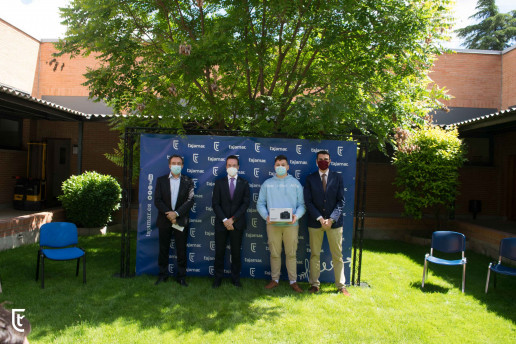 El Presidente de neobis, Álvaro García Barbero y Joao Fernandes Dias, Product Marketing Manager de Canon, entregan el premio al ganador de la quinta edición del concurso neobispress. El ganador, Eduard Pirtac, alumno de primer curso del Ciclo Formativo de Grado Medio de Preimpresión Digital, en Tajamar recibe el galardón y una cámara réflex CANON EOS 250D.