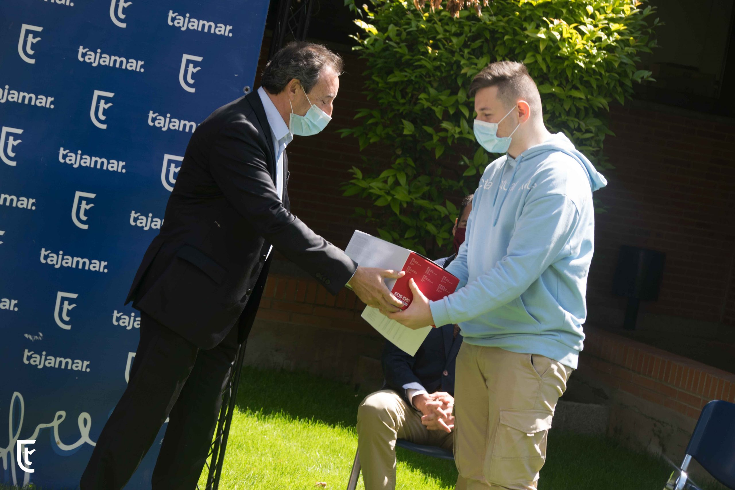 El Presidente de neobis, Álvaro García Barbero y Joao Fernandes Dias, Product Marketing Manager de Canon, entregan el premio al ganador de la quinta edición del concurso neobispress. El ganador, Eduard Pirtac, alumno de primer curso del Ciclo Formativo de Grado Medio de Preimpresión Digital, en Tajamar recibe el galardón y una cámara réflex CANON EOS 250D.