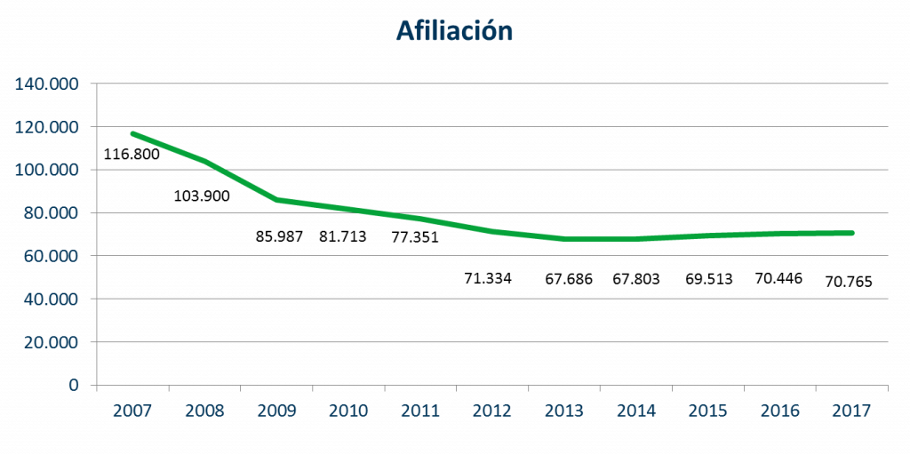 Se observa también un abandono progresivo de las personas demandantes de empleo en nuestro sector, bien porque han perdido la esperanza de encontrar empleo, bien porque se han ocupado. Hemos pasado de tener un paro registrado de 20.051 trabajadores en 2012, a tener 11.713 en diciembre de 2017.