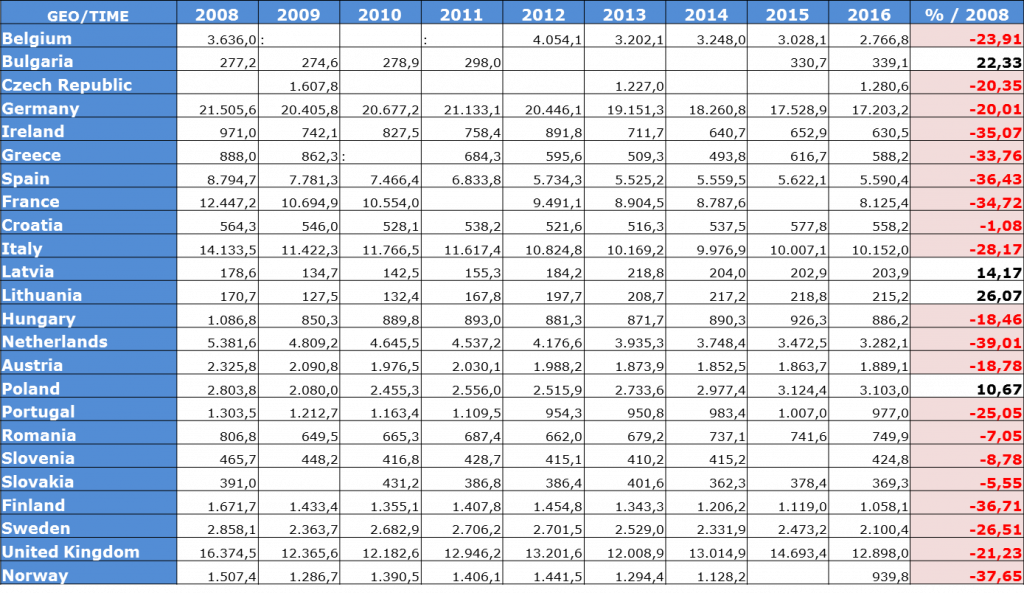 En Europa ocurren cosas similares que en España respecto del tamaño del sector y tendencias. El volumen de facturación, el número de empresas y el de trabajadores decrece prácticamente en casi todos los países excepto en algunos de la Europa del Este. Claro está que es menos impactante en los resultados que Estonia crezca un 71% a que Alemania decrezca un 16%.