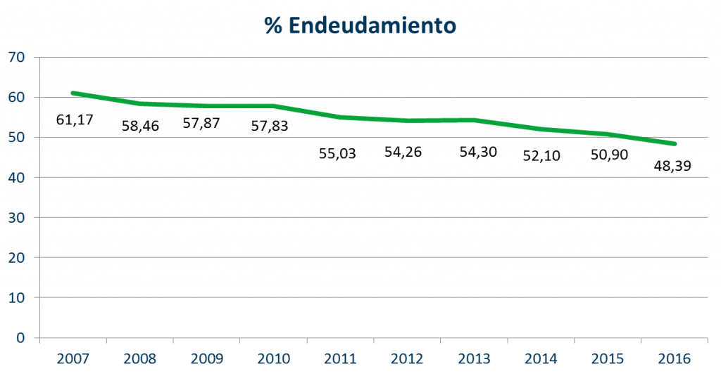 El endeudamiento de las empresas se sigue presentando como factor clave en el análisis. Por una parte, se puede constatar cómo un menor endeudamiento equivale a un mejor resultado en las empresas que mejor se comportan. Por otra, cómo el sector sigue dedicado a reducir la deuda que contrajo en años anteriores.