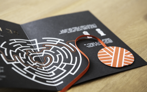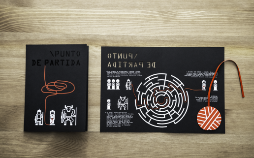 Impreso con la versátil Versafire EV, el díptico contiene un punto de libro que podrán utilizar para no perder el rumbo de su lectura, una madeja de hilo rojo que les permitirá volver siempre al Punto de partida.