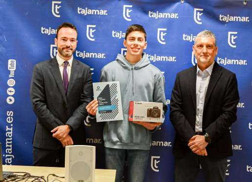 El ganador del concurso, Juandiego Trujillo, alumno de segundo curso del Ciclo Formativo de Grado Medio de Preimpresión Digital, en TAJAMAR recibe el premio, una cámara Canon EOS 250D